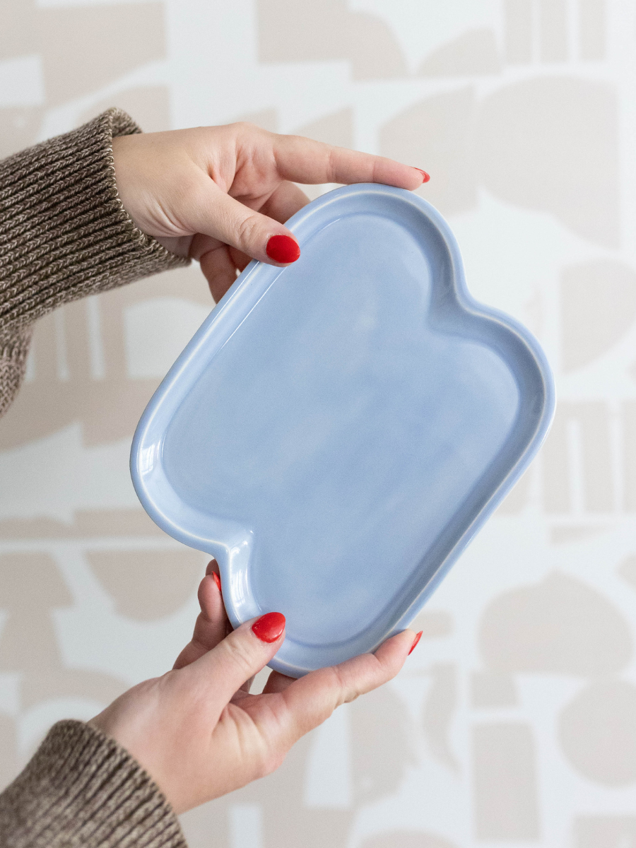 We developed this new tray after creating Whitney Manney’s Doodle Tray. After retiring our beloved Geo Tray we realized there was a hole that we needed to fill in our studio series. Molly, our lead production artist, started with cardboard cutouts so we could hold different shapes, and we landed on this one. It looks like two little jelly beans smooshed together and the name just stuck.