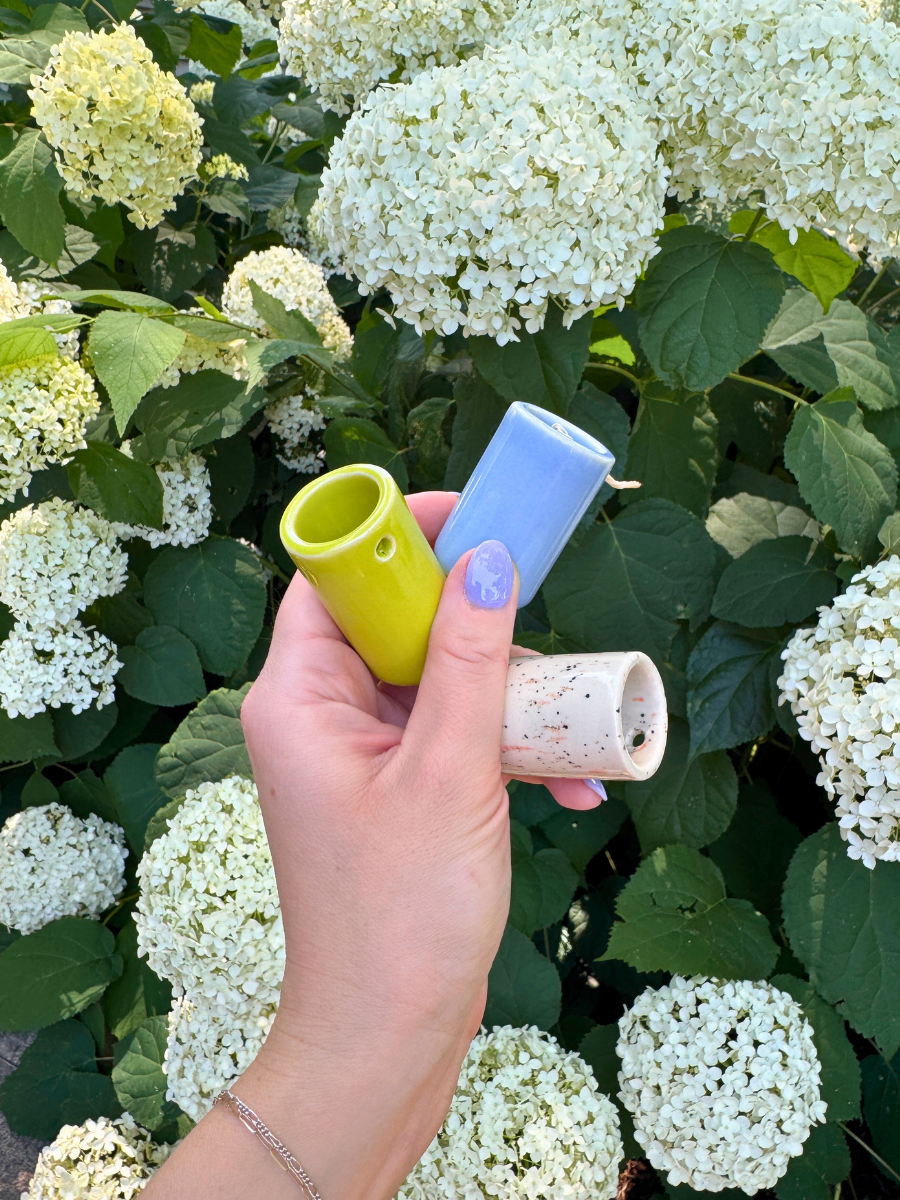 To clean our ceramic smokeware, stream in your cleaning solution of choice, plug the holes to shake, and swipe the sticky bits with a pipe cleaner. For a full tutorial view our Care guide.