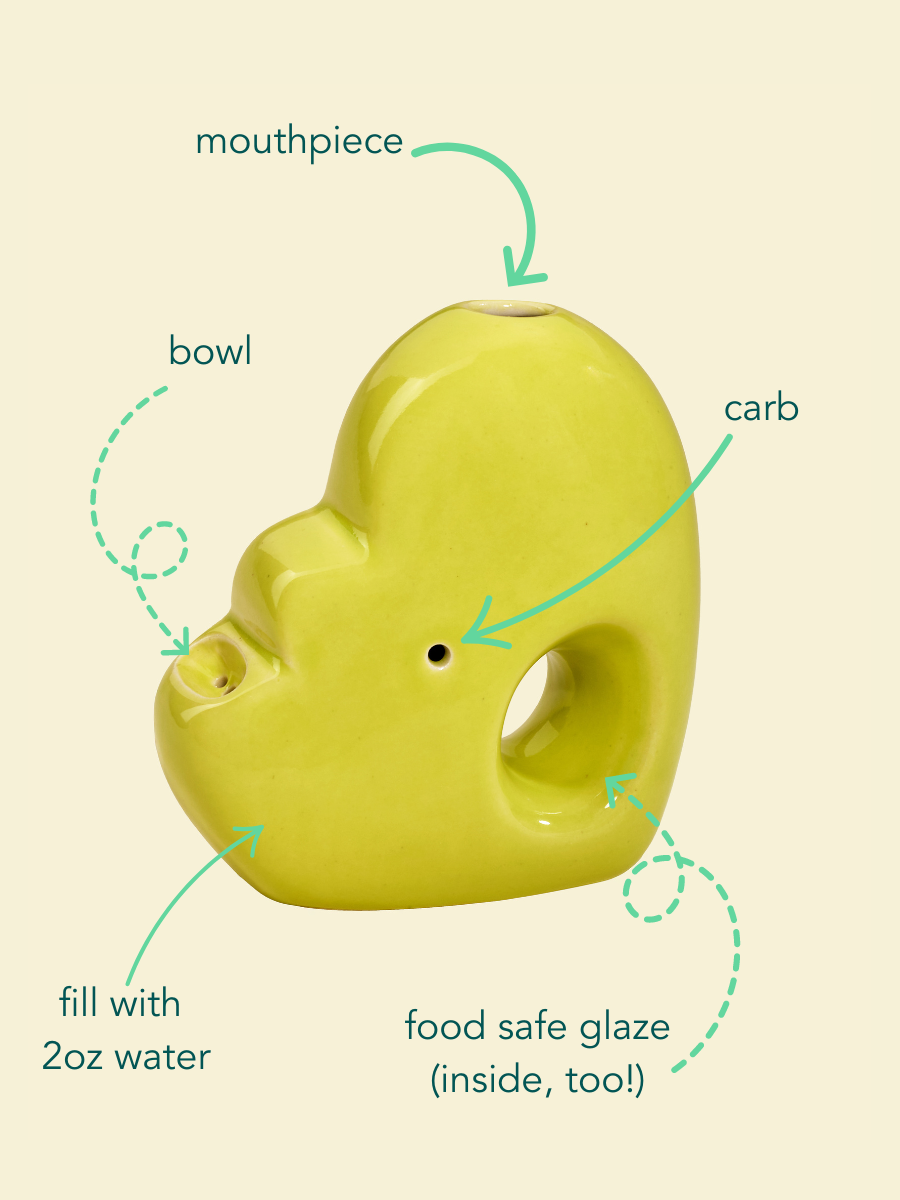 To clean our ceramic smokeware, stream in your cleaning solution of choice, plug the holes to shake, and swipe the sticky bits with a pipe cleaner. For a full tutorial view our Care guide.