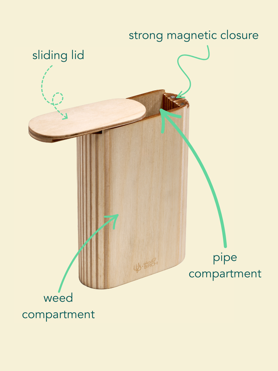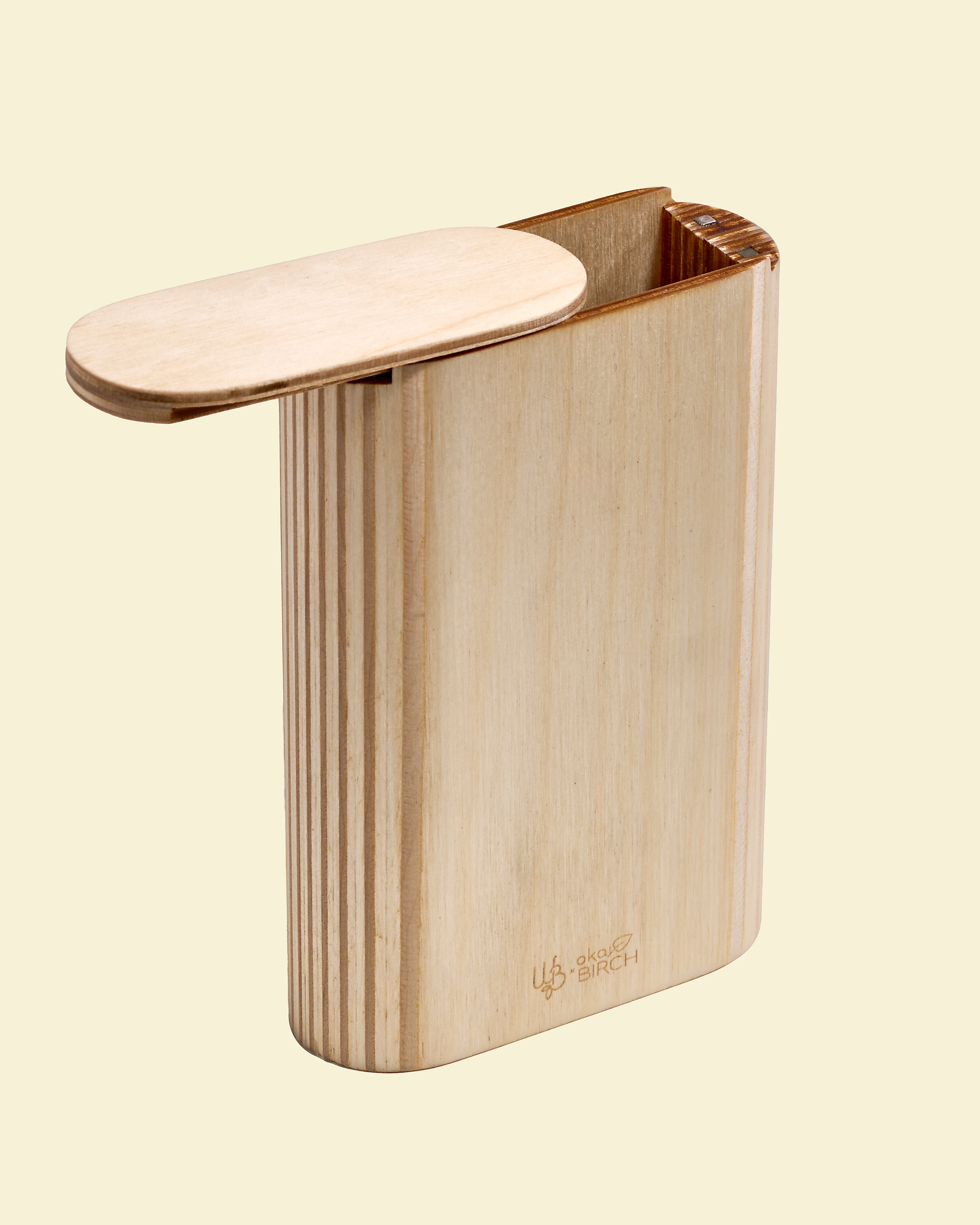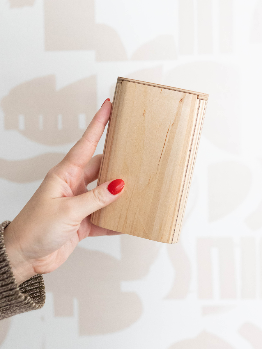 Layers of birch assembled by hand, laser-cut, and topped with a lid that slides on a track with magnets that snap it in place.