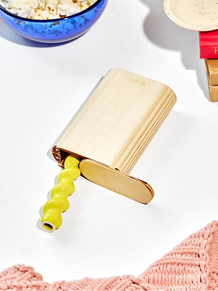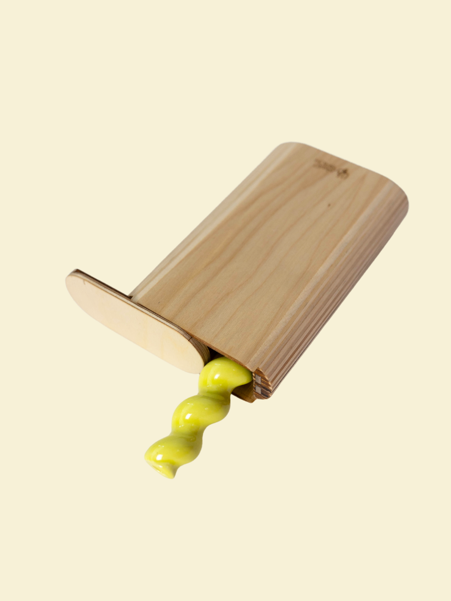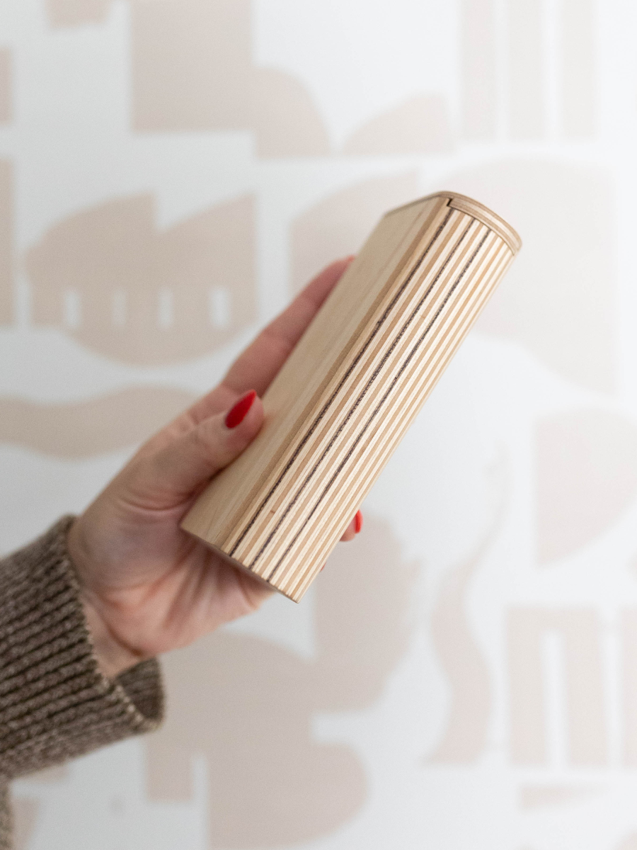 Layers of birch assembled by hand, laser-cut, and topped with a lid that slides on a track with magnets that snap it in place.