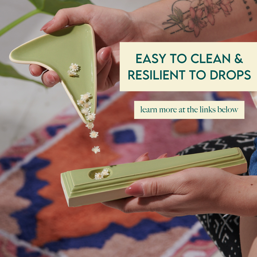 To clean our ceramic smokeware, stream in your cleaning solution of choice, plug the holes to shake, and swipe the sticky bits with a pipe cleaner. For a full tutorial view our Care guide.