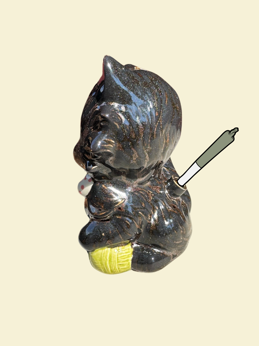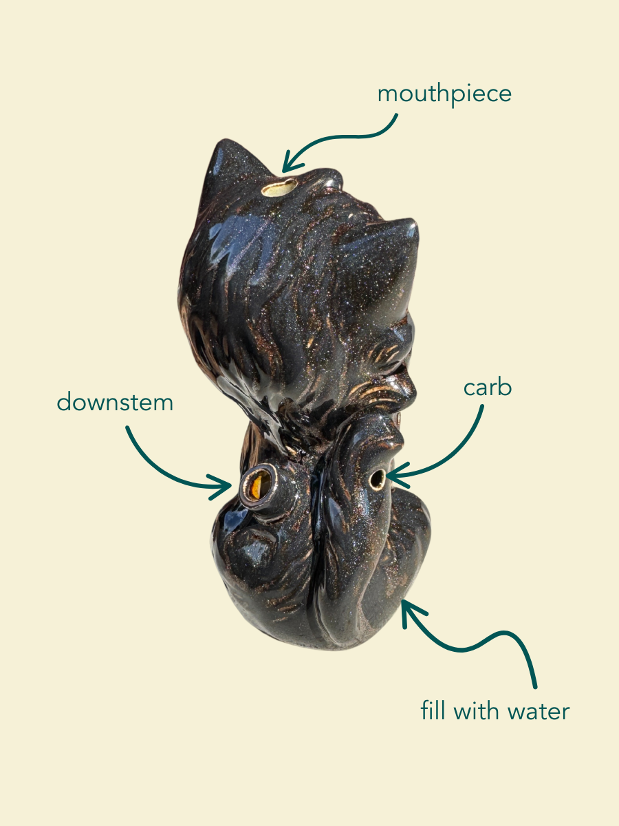 To clean our ceramic smokeware, stream in your cleaning solution of choice, plug the holes to shake, and swipe the sticky bits with a pipe cleaner. For a full tutorial view our Care guide.