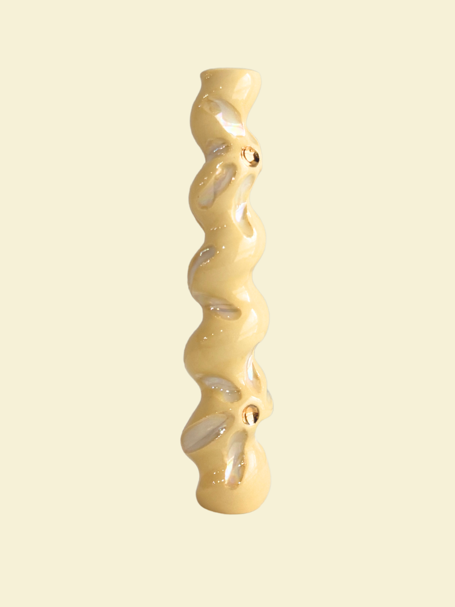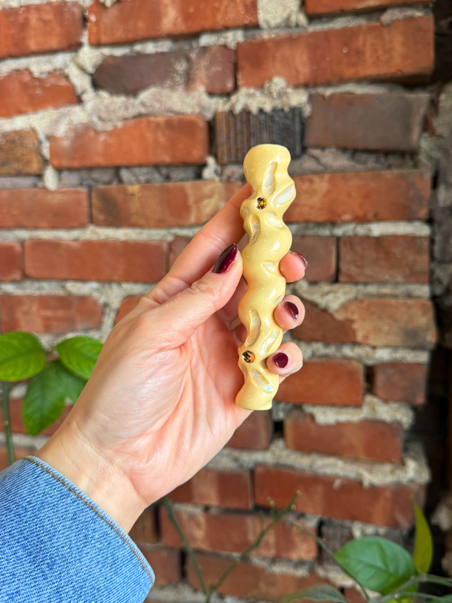 One of a kind butter yellow, mother of pearl & 22k gold chillum. Made using stained slip, carved and painted by hand.